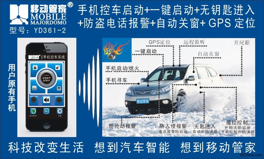 手機與汽車通過軟件,實現無線同步,實現一鍵啟動免鑰用車!移動管家手機控車系統——-具有汽車遠程啟動、汽車遠程熄火、遠程開關車門鎖、遠程斷油!智能感應開關門鎖、免鑰一鍵啟動、一鍵熄火、GPS查車、APP軟件控車、智能防盜、手機管控汽車、、、、、汽車智能大潮即將襲來,世界上最先進的智能控車系統.