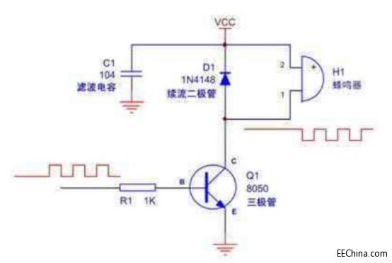 蜂鳴器驅動電路一般包含:一個三極管、一個蜂鳴器、一個續流二極