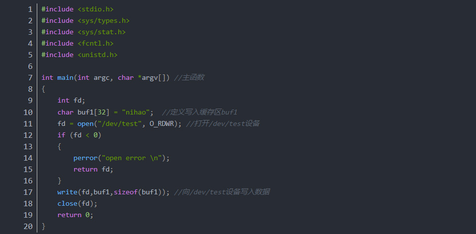 編寫測試APP其實是在編寫Linux應用,在應用程序中向設備文件寫入數據,編寫完成的應用程序app.c代碼如下所示: