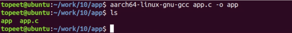 因為測試APP是要在開發板上運行的,所以需要aarch64-linux-gnu-gcc來編譯,輸入以下命令,編譯完成以后會生成一個app的可執行程序,如下圖(圖15-4)所示: