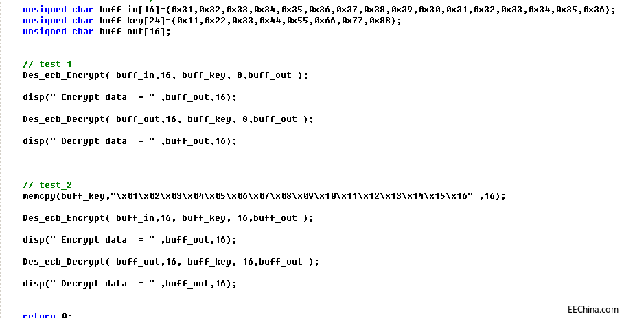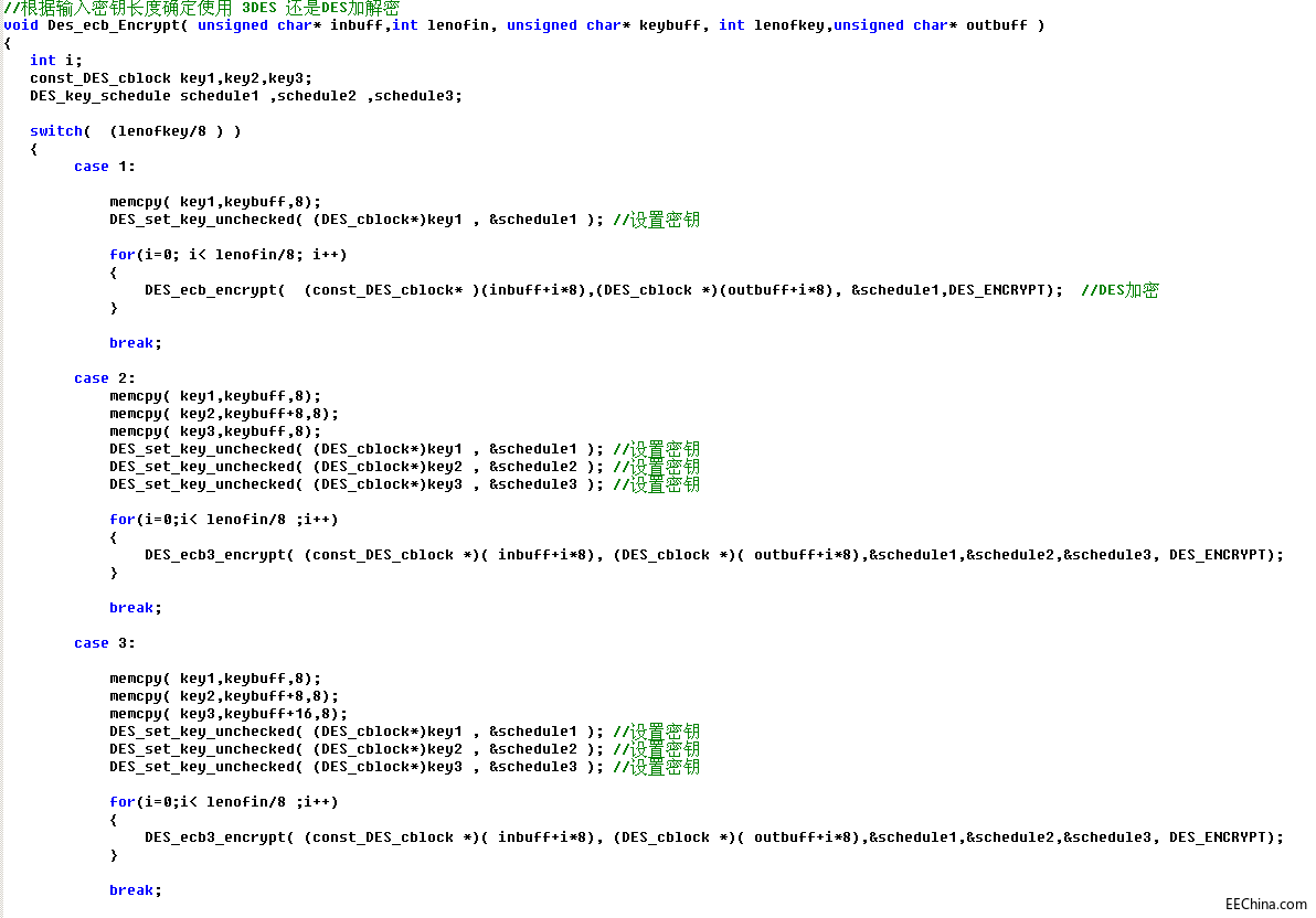 DES_ecb_encrypt((const_DES_cblock*)(inbuff+i*8),(DES_cblock*)(outbuff+i*8),&schede1,DES_ENCRYPT);此函數用于實現DES ECB模式加密。