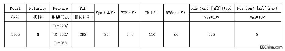 針對這種需求,飛虹電子研發出適用于300W/12V輸入的逆變器的前級電路的FHP3205 MOS管,這款MOS管采用N溝道溝槽工藝,封裝形式為TO-220/TO-252/TO-263,腳位排列是GDS,其他具體參數請看這里: