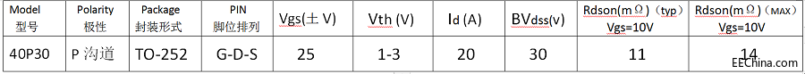 為了解決電子工程師在設(shè)計(jì)電源的時(shí)候能提高過(guò)流保護(hù)的功能,飛虹電子研發(fā)了型號(hào)為40P03的MOS管,采用P溝道溝槽工藝,封裝形式為TO-252,腳位排列是G-D-S,其他參數(shù)請(qǐng)看下圖:
