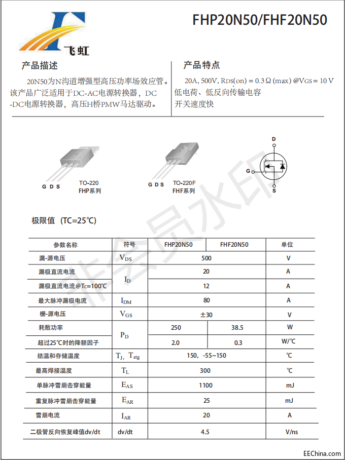 針對市場上對優(yōu)質(zhì)MOS管的需求,飛虹電子通過技術(shù)創(chuàng)新研發(fā)了型號為FHP20N50 / FHF20N50的高壓MOS管,適用于逆變器的前級電路,采用TO-220/TO-220F/TO-3PN的封裝形式,腳位排列為GDS,具體參數(shù)請看下圖: