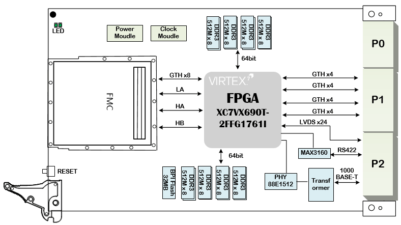 板卡功能 | 參數內容 | 主處理器 | Xilinx XC7V690T-2FFG1761I | 板卡標準 | VPX VITA 46.0 | 電氣規范 | PCIe 2.0,3.0 X4 | FMC接口 | FMC ANSI/VITA 57.1 – 2008 ,ASP-134486-01 HPC中LA,HA,HB全部接口和DP0~DP7 8路高速接口 | 板載緩存 | 兩組DDR3,每組512Mx64bit(4GB), MT41K512M8RH-125-IT | 加載Flash | BPI加載模式,BPI Flash 2Gb | VPX接口 | P1: GTX x16, 支持PCIe、SRIO協議 P2: LVDS x24,一路RS422,一路1000Base-T | 仿真器接口 | 1x 6Pin JTAG接口,間距2.54mm | LED | 兩個,電源狀態指示燈,FPGA狀態指示燈(可編程) | 復位方式 | 外復位 | 板卡尺寸 | 100mm x 160mm x20mm | 板卡重量 | (含散熱片) | 板卡供電 | +12V@4A | 板卡功耗 | 48W | 工作溫度 | Industrial -20℃到+70℃ |