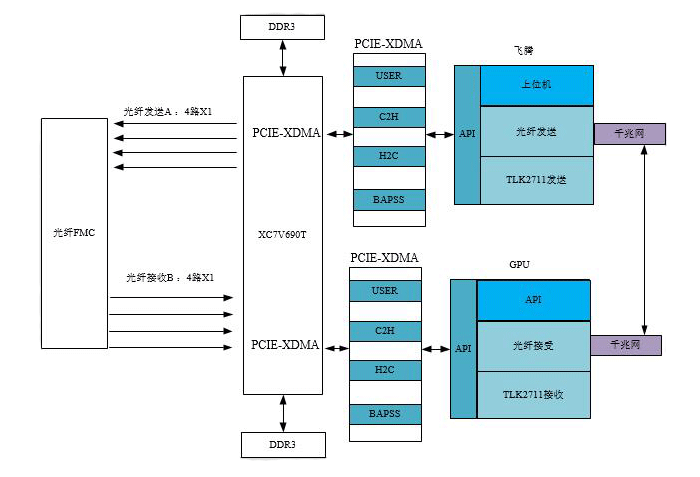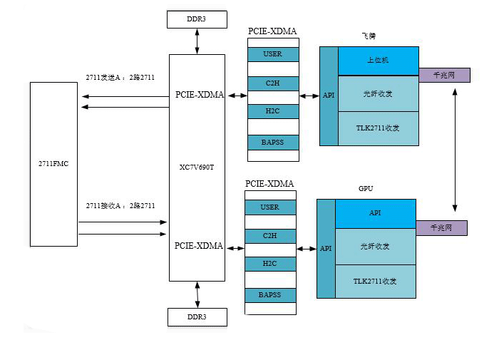 4路TLK2711接口,2路作為發送端口,2路作為接收端口,每路接口互不影響。 接收端:數據流從TLK2711接收端進來,存到FPGA的DDR中,然后通過PCIE導入到GPU中。 發送端:數據存在飛騰主板中,飛騰通過PCIE寫入FPGA的DDR中,FPGA取走數據,通過TLK2711發送端口發送出去。 GPU接收的數據通過千兆網發送到飛騰主板中。
