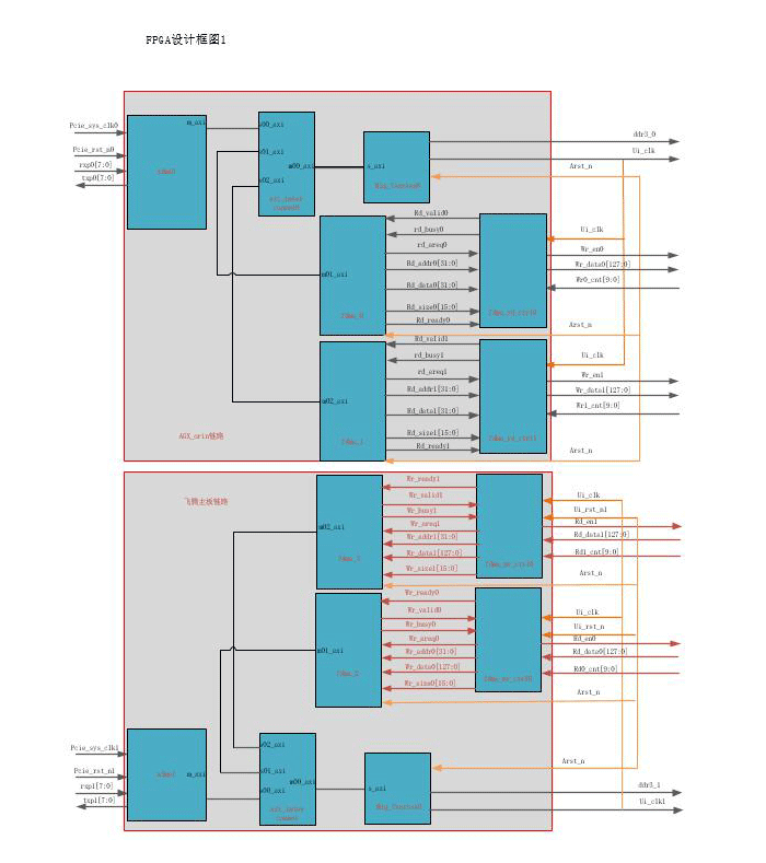 3.3 FPGA流程框架 如圖所示,FPGA程序可以大體劃分為PCIe端點控制器XDMA、DDR3讀寫控制以及TLK2711收發控制三部分。FPGA與PC的PCIe通信采用Xilinx的XDMA IP,邏輯模塊間采用AXI總線互聯方式。XDMA0數據鏈路為飛騰主板主控數據鏈路,XDMA1數據鏈路為Orin_GPU卡主控數據鏈路。 Orin_GPU卡主控數據鏈路:tlk2711子卡的接收端口接收到圖像數據緩存到第一組ddr3中,大小為4GB,對0-4GB的ddr3空間讀寫,gpu把圖像數據讀出并作處理。鏈路數據流向分為數據發送(FPGA-PC)(這里飛騰主板和Orin_GPU卡都稱為PC): 數據接收過程描述(FPGA-PC):圖像數據以1.6Gbps線速率通過rxp接口,wr_fifo把16bit數據位寬轉化為128bit數據位寬,fdma_ctrl的寫ddr3模塊把數據寫入到0-4GB的地址空間,通過定義的寄存器信號告訴主機軟件取出對應地址空間的數據,通過dma的C2H通道直接寫入主機內存。 飛騰主板主控數據鏈路:飛騰主板把圖像處理結果寫入板卡第二組ddr3中,fpga邏輯讀出ddr3中的數據通過tlk2711子卡的發送端口發送出去。(這里飛騰主板和Orin_GPU卡都稱為PC)。 數據發送過程描述(PC-FPGA):為了實現數據發送,主機軟件從主機內存固定位置讀出圖像處理數據發送到DMA的H2C通道,寫入到板載第二組DDR3的0-4GB的空間,主機軟件通過寄存器通知fdma_ctrl的讀ddr3模塊取出對應地址ddr3的數據,通過rd_fifo把數據128bit位寬變化到16bit后,給到tlk2711子卡的發送模塊,最后數據以1.6Gbps的線速率通過txp口發送出去。