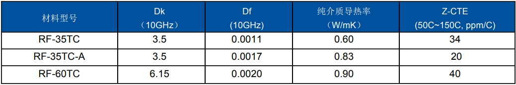 為了有效提升功率放大器的功率效率,應對熱對于功放長期可靠性的不良影響,推薦設計工程師選用如下幾款介電常數3.5的低損耗、高導熱率材料應用于高功率功放。同時,也為了應對射頻單元小型化的需求,推薦使用介電常數6.15的低損耗、高導熱率材料。