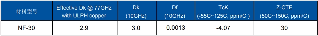 泰康利作為全球領先的高頻材料供應商,產品被廣泛應用于汽車中、長距毫米波防撞雷達、無人機毫米波防撞雷達等場景。NF-30作為一款不含玻璃纖維布的PTFE材料,在保證極低介質損耗的同時,能夠有效規避玻璃纖維所帶來的Skew問題和潛在的CAF風險,增強材料各向電氣性能一致性。此外,對于采用FOWLP方式封裝的毫米波芯片直接焊接到PCB上的情況,NF-30所具有的無編織玻璃布結構能夠有效的吸收芯片與PCB之間CTE不匹配所造成的焊點內應力,從而確保芯片焊接的長期可靠性(焊點連接處可以經受-55C~125C,1000cycle以上的冷熱循環測試而不失效)。