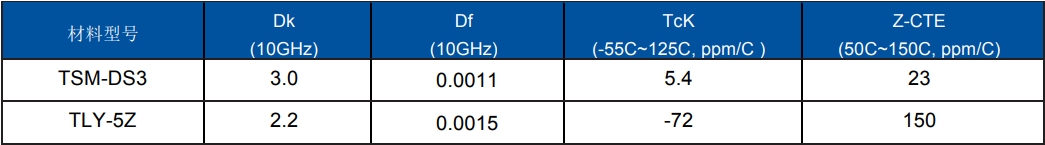 TLY-5Z作為一款含有玻璃纖維布+陶瓷填料的低損耗PTFE材料,克服了常規低介電常數PTFE材料Z軸方向膨脹系數偏大的缺點,可以有效的提升金屬化過孔的長期可靠性,更適合制作多層線路板。同時,在相同的介質厚度和阻抗控制下,低介電常數可使射頻線路設計得相對更寬,在毫米波頻段下,線路整體的插入損耗更低。