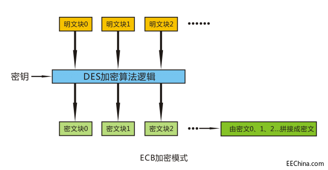 (3)按照下圖ECB加密模式所述的算法使用指定密鑰對每一個數據塊進行加密。