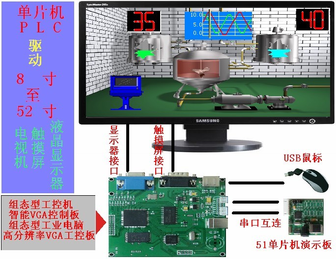 有了VGA控制板/組態(tài)型工控機(jī),您只需一個普通51單片機(jī)就可以作出豐富的人機(jī)界面,真正實現(xiàn)了用單片機(jī)“小牛推大車”。單片機(jī)或PLC就可以驅(qū)動8寸至52寸等大尺寸高檔液晶顯示器或者電視機(jī)。