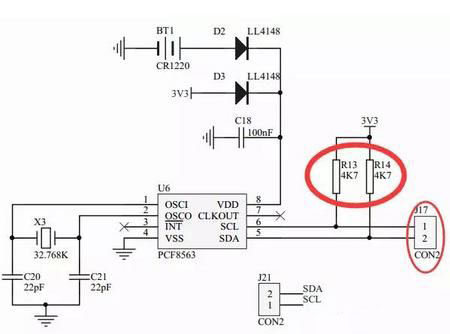 如上圖,R13和R14,一端接到了3.3V,一端通過J17連接到單片機引腳,這兩個電阻就是上拉電阻。
