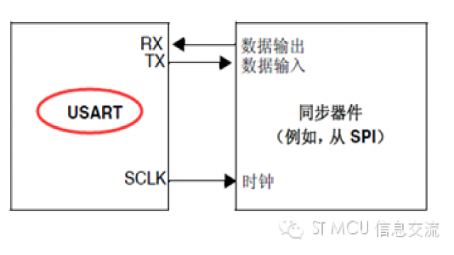 在上面圖中箭頭所指的SPI MASTER欄,我畫了4個(gè)紅圈。表示USART工作在同步模式可以配置為SPI主模式。工作原理如下圖所示。