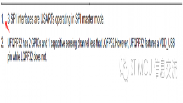 咋一看,這里SPI/I2S描述稍顯另類。那上方用小括號(hào)括起來的1表示下方有相關(guān)注釋的意思。那個(gè)0應(yīng)該是表示該芯片沒有I2S接口。關(guān)于(1)的注釋如下: