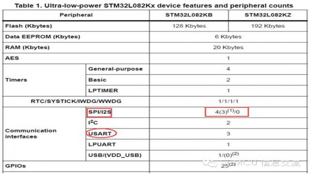 看到這里,可以得出結(jié)論,STM8L082K芯片有3個(gè)USART ,1個(gè)獨(dú)立的可工作在主從模式下的SPI。另外,可以將3個(gè)USART配置為3個(gè)工作在主模式下的SPI 。不支持I2S接口。