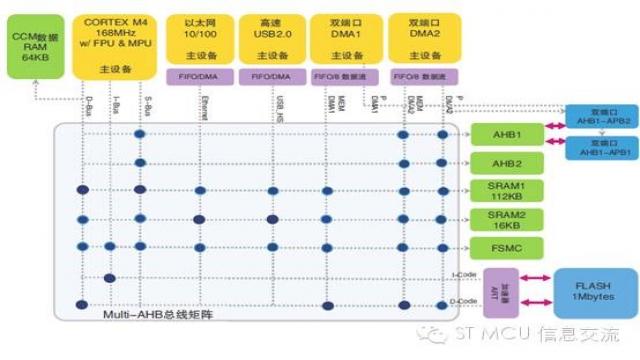 可能不少人見過STM32F4系列的內部系統架構框圖。大致如下圖,該圖很重要,不可視而不見。