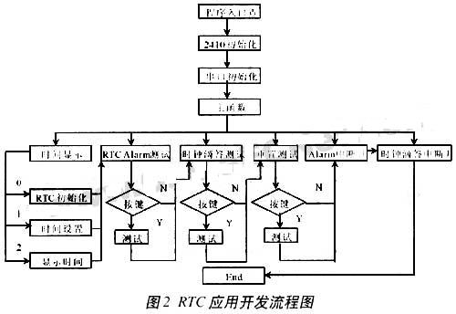 本設計基于S3C2410嵌入式開發平臺,并結合PC的超級終端完成RTC模塊的初始化、時間顯示(顯示于超級終端)、時間設置、重置測試、報警測試、時鐘滴答測試等功能。其程序開發流程如圖2所示,為了完成以上功能,需要前期的一些初始化工作。