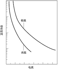 高分子PTC熱敏電阻是一種直熱式、階躍型熱敏電阻,其電阻變化過程與自身的發(fā)熱和散熱情況有關(guān),因而其維持電流(Ihold)、動(dòng)作電流(Itrip)及動(dòng)作時(shí)間受環(huán)境溫度影響。圖4為熱敏電阻典型的維持電流、動(dòng)作電流與環(huán)境溫度的關(guān)系示意圖。當(dāng)環(huán)境溫度和電流處于A區(qū)時(shí),熱敏電阻發(fā)熱功率大于散熱功率而會(huì)動(dòng)作;當(dāng)環(huán)境溫度和電流處于B區(qū)時(shí)發(fā)熱功率小于散熱功率,熱敏電阻將長期處于不動(dòng)作狀態(tài);當(dāng)環(huán)境溫度和電流處于C區(qū)時(shí),熱敏電阻的散熱功率與發(fā)熱功率接近,因而可能動(dòng)作也可能不動(dòng)作。圖5為熱敏電阻的動(dòng)作時(shí)間與電流及環(huán)境溫度的關(guān)系示意圖。熱敏電阻在環(huán)境溫度相同時(shí),動(dòng)作時(shí)間隨著電流的增加而急劇縮短;熱敏電阻在環(huán)境溫度相對(duì)較高時(shí)具有更短的動(dòng)作時(shí)間和較小的維持電流及動(dòng)作電流。