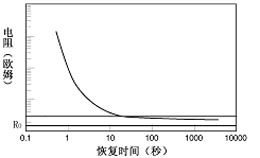 高分子PTC熱敏電阻由于電阻可恢復(fù),因而可以重復(fù)多次使用。圖6為熱敏電阻動(dòng)作后,恢復(fù)過程中電阻隨時(shí)間變化的示意圖。電阻一般在十幾秒到幾十秒中即可恢復(fù)到初始值1.6倍左右的水平,此時(shí)熱敏電阻的維持電流已經(jīng)恢復(fù)到額定值,可以再次使用了。一般說來,面積和厚度較小的熱敏電阻恢復(fù)相對(duì)較快;而面積和厚度較大的熱敏電阻恢復(fù)相對(duì)較慢。