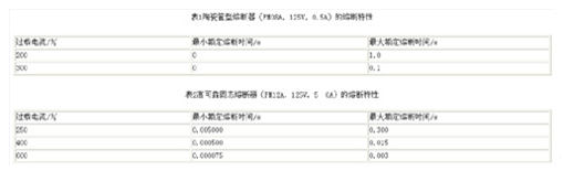 這種固態熔斷器分引線式和片式兩種類型。它是在陶瓷基體上用厚膜工藝制備設定形狀的特殊合金導電帶,這種合金導電帶的電阻具有正溫度系數。用特殊的樹脂包封,圖3是其結構示意圖。這種FM12型高可靠固態熔斷器具有以下特點:其熔斷特性與周圍環境的真空度無關(FM08型高可靠陶瓷管-金屬絲熔斷器與周圍真空度有密切關系);由于是固態結構,可承受強烈的振動,達30g/3kHz(FM08型為10g/2kHz),耐沖擊達1.5kg(FM08為100g);在過電流熔斷時,由于特殊樹脂的嚴密包封,不會發生爆炸現象,也不會出現電弧、氣體、微顆粒等污染;結構緊湊,體積小。表1是陶瓷管-金屬絲型熔斷器(FM08A)的特性數據。表2和圖4是美國AEM公司生產的高可靠固態熔斷器(FM12)的典型數據和特性曲線。可以看出,AEM生產的這種熔斷器,不僅規定了最大斷開時間(ClearingTime),而且給出了最小斷開時間。其它廠家的熔斷器幾乎都不提供這一數據,而在設計某些要求嚴格的電路時需要這些數據。
