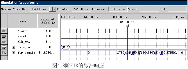 QuartusII內(nèi)部帶有仿真器,只要通過(guò)建立正確的Vector Waveform File(向量波形文件)就可以開(kāi)始仿真了。圖4所示為QuartusII內(nèi)部仿真器得到的8階FIR的脈沖響應(yīng)波形。