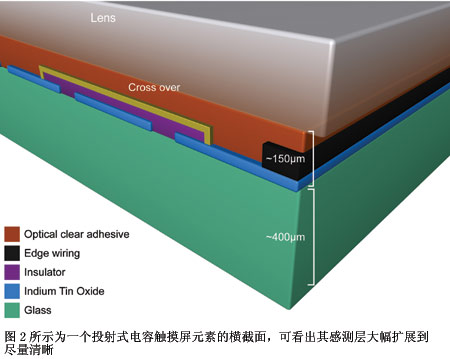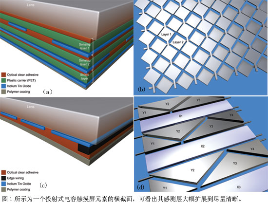 圖1a所示為一個投射式電容觸摸屏元素的橫截面,可看出其感測層大幅擴展到盡量清晰。這種感測層一般是由一種透明的導電材料制備的,比如真空淀積的銦錫氧化物 (Indium-Tin-Oxide, ITO),見黑色部分。在最終裝配之前,利用光刻或絲網印刷工藝 (類似于PCB的蝕刻方法),ITO層便會在塑料薄膜 (通常是PET薄膜) 襯底上蝕刻形成電極圖案。圖中沒有顯示出屏幕四邊連接ITO模塊,然后往下延伸到電氣連接器的銀墨連線。這些ITO層通過一種透明的粘膠彼此融合在一起,形成觸摸屏鏡片;粘膠一般為一層薄片,整個層式結構利用層壓工藝融為一體。