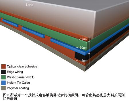 現在有一些更先進的設計是直接在純平觸摸屏上涂敷感測層,完全無需載體層 (圖3)。利用這種方法可以把整個面板做得更薄,當然也進一步改進了光學特性。每減少一層,就降低了一部分成本和測試時間,從而提高解決方案的經濟效益,更有利于大批量生產。所以單層電極結構非常適合于這類構建。