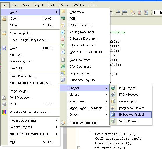 在嵌入式系統工程添加用戶配置文件(myrtos.oil)及系統控制源代碼(mymain.c)。選擇菜單[menus]File>>New>>C Source Document 及Text Document;也可以在工程欄中選中嵌入式系統工程名,然后點擊鼠標,選擇[popups]Add New to Project>>C file 及Text Document。保存文件,重新命名為mymain.c及myrtos.oil。