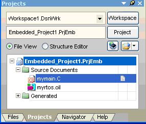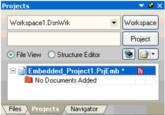 選擇菜單 [menus]File>>New>>;Project>>Embedded Project,在工程欄中將會顯示新建的嵌入式系統工程名,選擇菜單[menus]File>>Save Project,在對話框中修改工程名稱,然后Save。在工程欄中選擇File View選項,在工程中將會列出所有屬于當前工程的文件。注:Structure Editor選項用于編輯工程中文件間的鏈接關系。