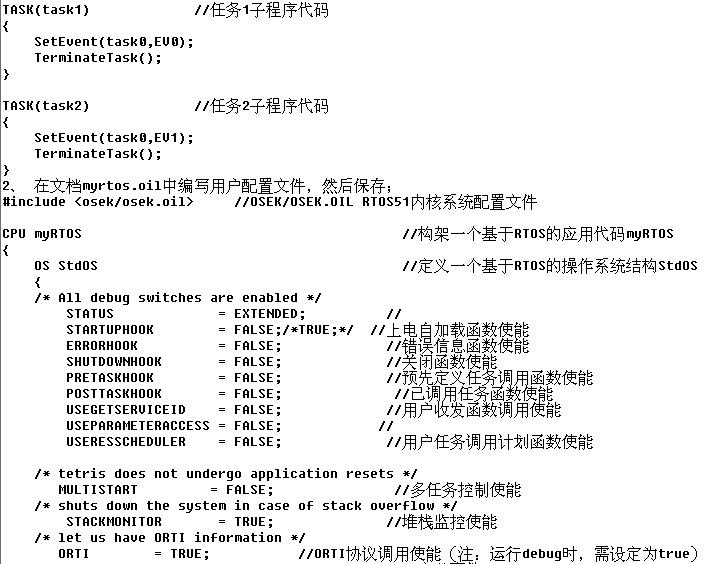 為了便于演示,在這個嵌入式系統工程中僅涉及到了用戶配置文件(myrtos.oil)及系統控制源代碼(mymain.c)兩個文件。實際上,用戶可以根據軟件設計的需要添加函數頭文件及子程序源代碼。在工程建立后,Nexar將自動生成一個 makefile(在本項目中為myrtos.mak),在該文檔中包含了嵌入式系統構架規則;在每次重編譯時,Nexar將會按照makefile中的設定更新嵌入式工程目標代碼。在嵌入式系統工程中RTOS庫的建立是通過OIL文件中的參數設定。