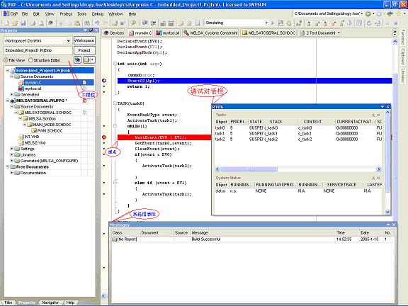 首先打開主程序文檔,然后在工程欄中用鼠標右鍵點擊嵌入式項目工程并在彈出的浮動命令條上選擇simulate命令,接下來通過選擇系統菜單[menus]View>>Workspace Panels>>Embedded>>RTOS命令調出調試信息對話框,從系統菜單中選擇[menus]Debug>>RTOS>>Tasks命令,最后按功能鍵F9,仿真執行嵌入式項目。為了便于觀察項目的運行狀態,在調試信息對話框中可以添加相應的關鍵字或在主程序中設定斷點,如圖2.2。