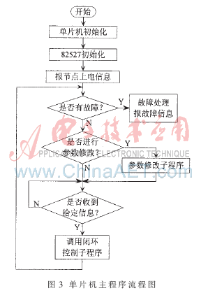 單片機的主程序流程如圖3所示,包括單片機與82527的初始化程序和各子程序。對反復執行的程序段利用主程序調用子程序的方式實現。子程序主要有閉環控制子程序、故障處理子程序和參數修改子程序。