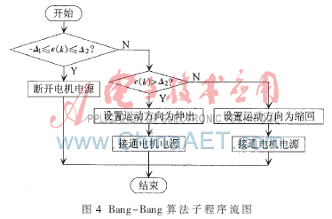 由于伺服電機正轉和反轉時推桿運動的慣性不同,所以正、反向最大誤差允許值Δ2和Δ1一般是不相等的。圖4是Bang-Bang算法子程序流圖。