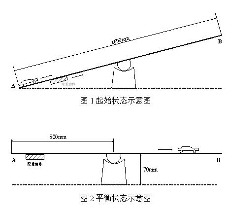 設計并制作一個電動車蹺蹺板,要求蹺蹺板起始端一側裝有可移動的配重物體,配重物體位置可調范圍不小于400mm。電動車從起始端出發,按要求自動在蹺蹺板上行駛。電動車蹺蹺板起始狀態和平衡狀態示意圖分別如圖1和圖2所示。
