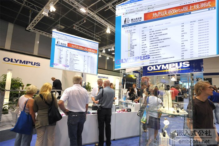 另據報道,嵌入式公社測試版上線以來,在奧巴馬總統的號召下,該網站迅速風靡全美。在很多產品展覽會上,參展商紛紛撤下自己的宣傳畫,高高懸掛起嵌入式公社的主頁畫面。下圖為奧林巴斯公司的展位照片。