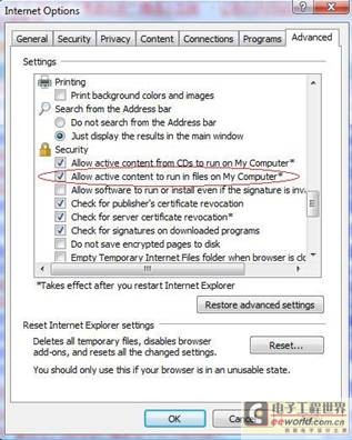 對的,就是在IE的Internet Options對話框里,安全選項(Security)中“Allow active content to run in files on My computer”的選項默認是不選的。選上這個設置之后,運行Silverlight TV時就不會有安全提示出現了。