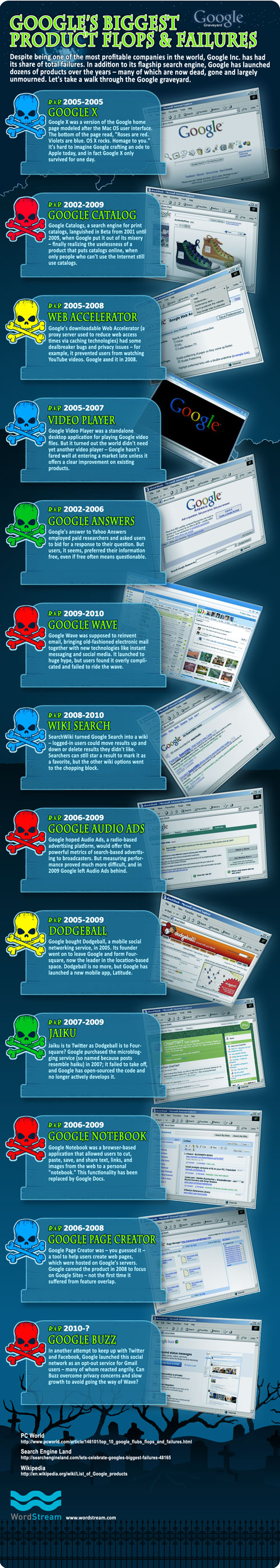 標題: 走入 Google 失敗產品的墓地 [打印本頁] 作者: f.luo 時間: 2011-1-7 09:58 標題: 走入 Google 失敗產品的墓地 WordStream做了一個超級大圖,展示了自Google于1998年成立到2010年底,所有失敗的Google產品,