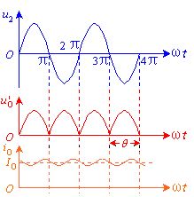 在橋式整流電路中,當(dāng)u2正半周時,D1、D3導(dǎo)電,電感中的電流將滯后u2不到90°。當(dāng)u2超過90°后開始下降,電感上的反電勢有助于D1、D3繼續(xù)導(dǎo)電。當(dāng)u2處于負(fù)半周時,D2、D4導(dǎo)電,變壓器副邊電壓全部加到D1、D3兩端,致使D1、D3反偏而截止,此時,電感中的電流將經(jīng)由D2、D4提供。由于橋式電路的對稱性和電感中電流的連續(xù)性,四個二極管D1、D3;D2、D4的導(dǎo)電角θ都是180°,這一點與電容濾波電路不同。