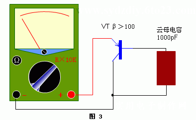 測量電解電容器時,由于其引腳有正、負極之分,應將紅表棒接電容器的負極,黑表棒接電容器的正極,這樣測量出來的漏電電阻才是正確的。反接時一般漏電電阻要比正接時小,利用這一點,還可判斷出無極性標志的電解電容器的極性。如果電容器的容量太小,如在4700P以下,就只能檢查它是否漏電或擊穿,如果在測量中,表針擺動一下回不到∞處,而是停留在0-∞處的中間某一位置上,說明該電容器漏電嚴重;也可采取圖3所示的辦法。在萬用電表與被測小電容器之間加裝一只NPN型硅三極管,要求其β值大于100,集電極-發射極之間的耐壓應大于25V,ICEO越小越好。被測電容器接到A、B兩端。由于三極管VT的電流放大作用,較小容量的電容器也能引起表針較大幅度的擺動,然后返回到∞位置,如不能返回到∞處的,則可估測出漏電電阻。