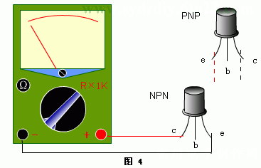 在檢查三極管的穿透電流大小時,可采用圖4所示的測量法,圖中被測的是NPN型三極管,如果是NPN型三極管,其測試棒應與管腳對調。萬用電表的量程一般選用R×100或R×1kΩ檔,要求測得的電阻值越大越好,對于中功率的鍺管,此值應大于數千歐;對于硅管,此值應大于數百千歐。如果所測得的數值過小,說明管子的穿透電流大,管子的性能不好。如果測量時萬用電表的表針搖擺不定,說明管子的穩定性很差。如果測得的阻值接近于零,說明管子內部已擊穿短路,不能使用。
