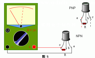 在檢查三極管的放大性能β值時,可以采用圖5所示的估測法。如果被測管是NPN型,可按此方法測試,如果被測管是PNP則按虛線方式連接。測量時表針應向右偏轉,其偏轉角度越大,說明管子的放大倍數β越大。如果加上電阻R之后表針變化的角度不大或根本不變,則說明管子的放大作用很差或已經損壞。其R的阻值可在51kΩ-100kΩ范圍內選取。也可能利用人手的電阻,用手捏位管子的c-b兩極,但不要使它們短路,以手的皮膚電阻代替R。