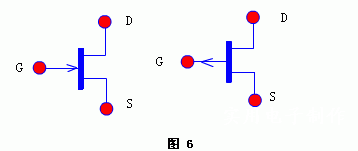 對于結型場效應管,已知型號與管腳,如果用萬用電表測G(柵極)和S(源極)之間,G與D(漏極)之間沒有PN結電阻,說明該管子已壞。用萬用電表的R×1kΩ檔,其表棒分別接在場效應管的S極和D極上,然后用手碰觸管子和G極,若表針不動,說明管子不好;若表針有較大幅度的擺動,說明管子可用。結型場效應管電路符號與引腳如圖6所示。