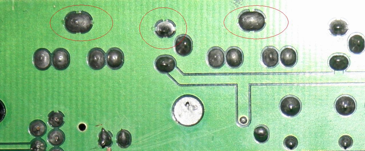 最近做了幾塊電路板,全是GND孔的焊接有點難,而且有的小孔錫根本剔不出來,經(jīng)常導致板子報廢。請看下面的圖片。