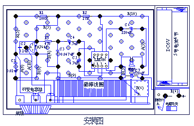 在初學(xué)電子知識(shí)時(shí),為了安全和擴(kuò)大普及面,讓更多年齡更小的學(xué)生能早一點(diǎn)接觸電子技術(shù),我們選用了螺孔板作為基本的安裝模板,因此安裝圖也就變成另一種模式,如圖: