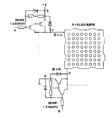 LED智能顯示屏是由微型計算機控制,以LED矩陣板作顯示的系統,可用來顯示各種文字及圖案。該系統中的行驅動器和列驅動器均可采用高β、高速低壓降的達林頓管。圖2是用BD683(或BD677)型中功率NPN達林頓管作為列驅動器,而用BD682(或BD678)型PNP達林頓管作行驅動器,控制8×8LED矩陣板上相應的行(或列)的像素發光。