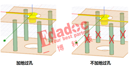 那我們一般情況下認為的信號由過孔來換層,為什么在附近位置要加地過孔呢?我們來看一個很形象的仿真模型,左右分別是換層信號孔附近加和不加地過孔的模型,我們的信號線從表層由過孔換到靠下的內(nèi)層,大家猜猜下面兩種情況下的仿真結(jié)果會有什么差異嗎?