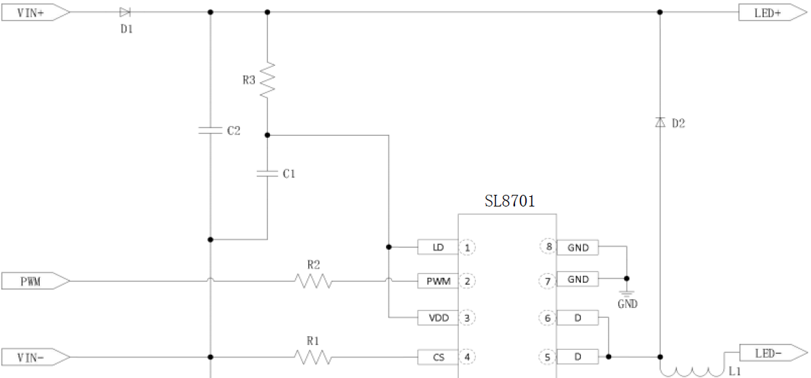 芯片通過對 LD 端口實現模擬調光功能。 LD 接