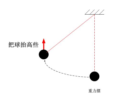 我們還可以把球“舉高”些,使其具有一定的“初始勢能”。然后在放開,球就可以擺動起來了。呵呵