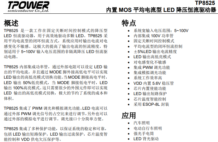 天源TP8525 2.5A平均電流型 LED 降壓恒流車燈